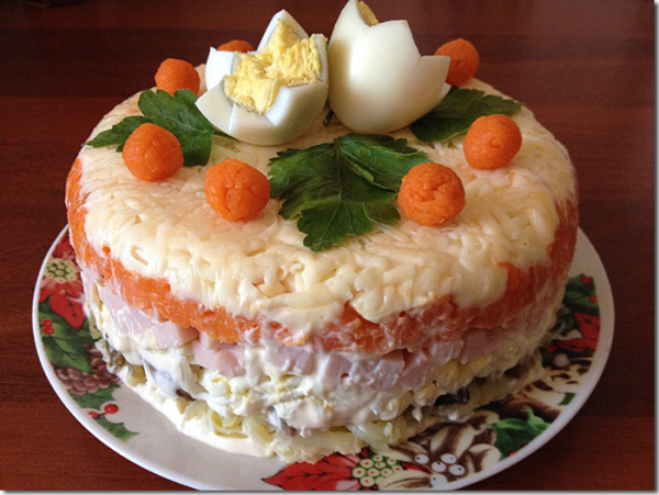 Эта закуска несколько похожа на традиционный крабовый салат. Однако это лишь на первый взгляд. Из «традиционных» ингредиентов здесь только яйца, кукуруза и крабовые палочки. Пикантность во вкус закуски вносит апельсин. Автор салата предлагает заменить его мандарин. Тем более что последнего в преддверии Нового года в холодильнике более чем достаточно.